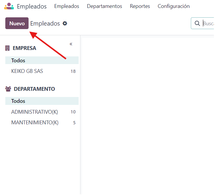5. Creamos al empleado abrimos la aplicación Empleados y haga clic en el botón Nuevo que se encuentra en la esquina superior izquierda. Esta acción abrirá un formulario de empleado vacío.