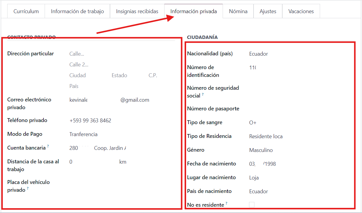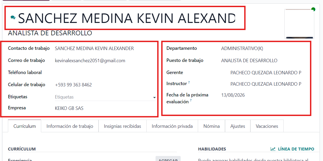 - Correo de trabajo: Es el contacto donde el empleado recibirá sus recibos de nómina (Rol de pago).